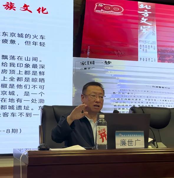 讲座中,廉世广校友以《牡丹江深厚的文学艺术土壤与牡师院的文学传统》为题,从历史纵深与学院传承两个维度,深入剖析了这片黑土地深厚的文学底蕴及其生生不息的文脉。谈及牡丹江独具特色的少数民族文化、厚重的历史文化积淀和文学艺术传承时,他深情讲述:“这就是牡丹江,一座美丽的城市,一座英雄的城市,一座孕育了‘一书一戏’红色经典的城市,一个吸引我前来求学的城市。牡丹江四年的读书经历,承载了我宝贵的青春年华和美好记忆,令人刻骨铭心”。廉世广校友勉励在场学子:珍惜牡丹江深厚的文化底蕴,汲取牡师院优良的文学传统,做到崇德尚学,厚积薄发,在传承中创新,于笔墨间寻找自我价值与时代共鸣,无论未来走向何方,都能成为牡丹江文脉的传承人与传播者,为讲好龙江故事、中国故事贡献文学的力量。